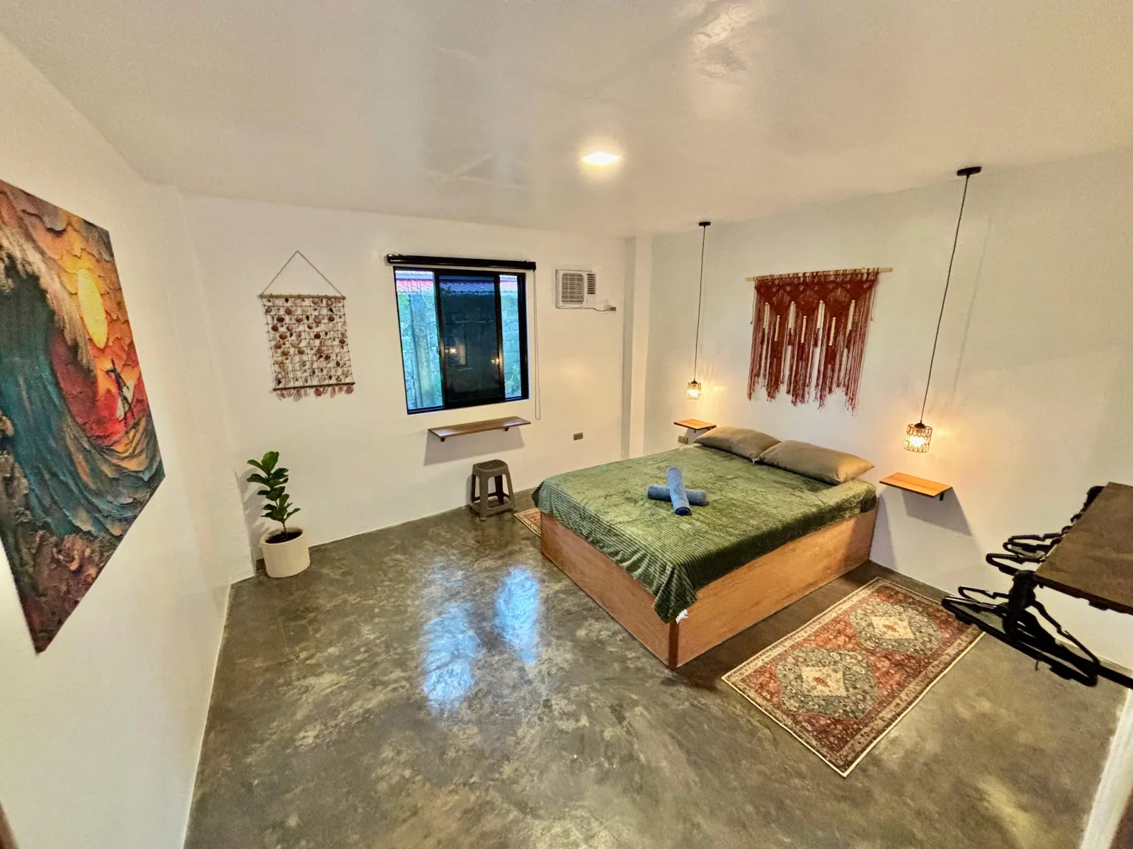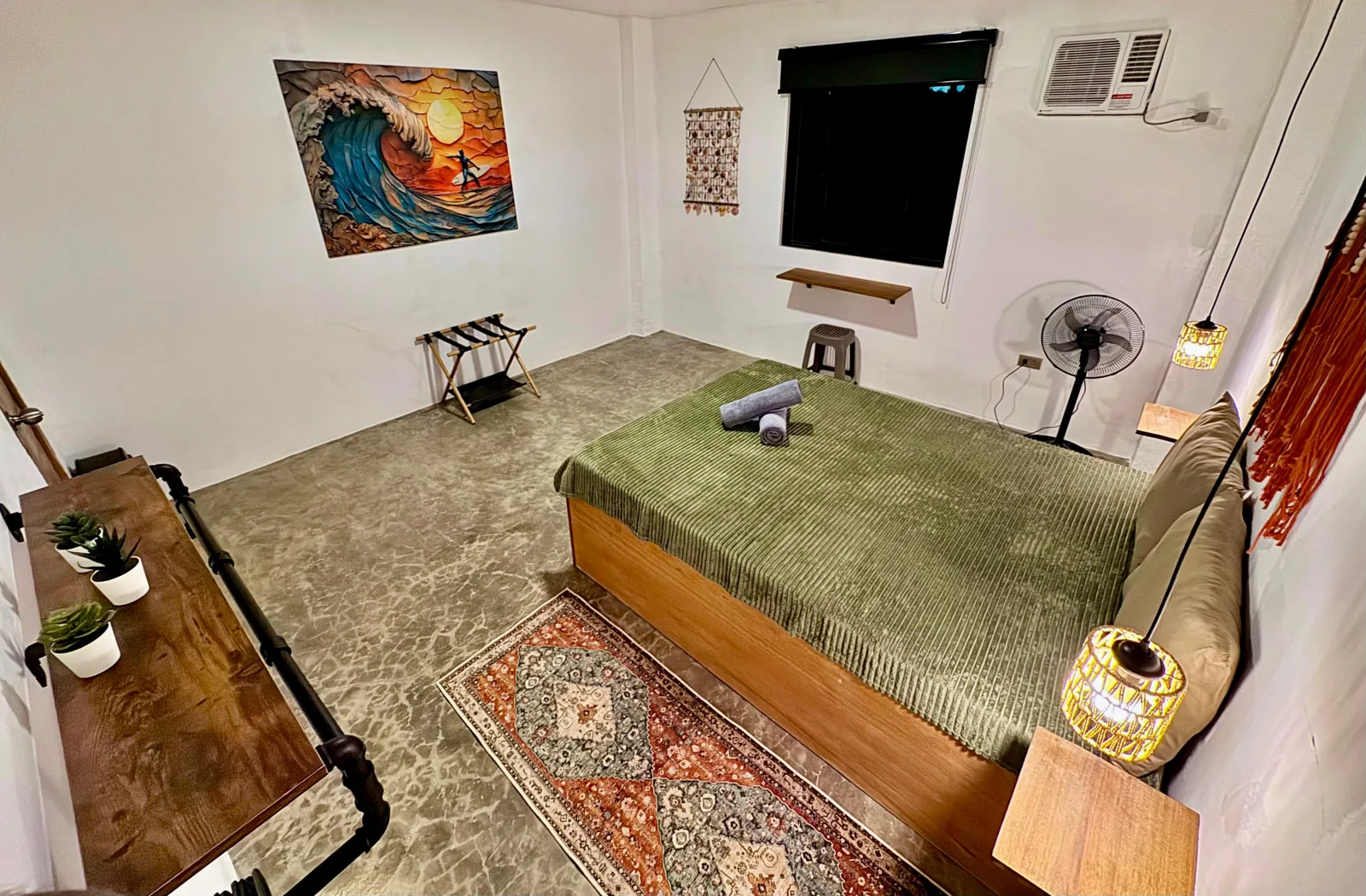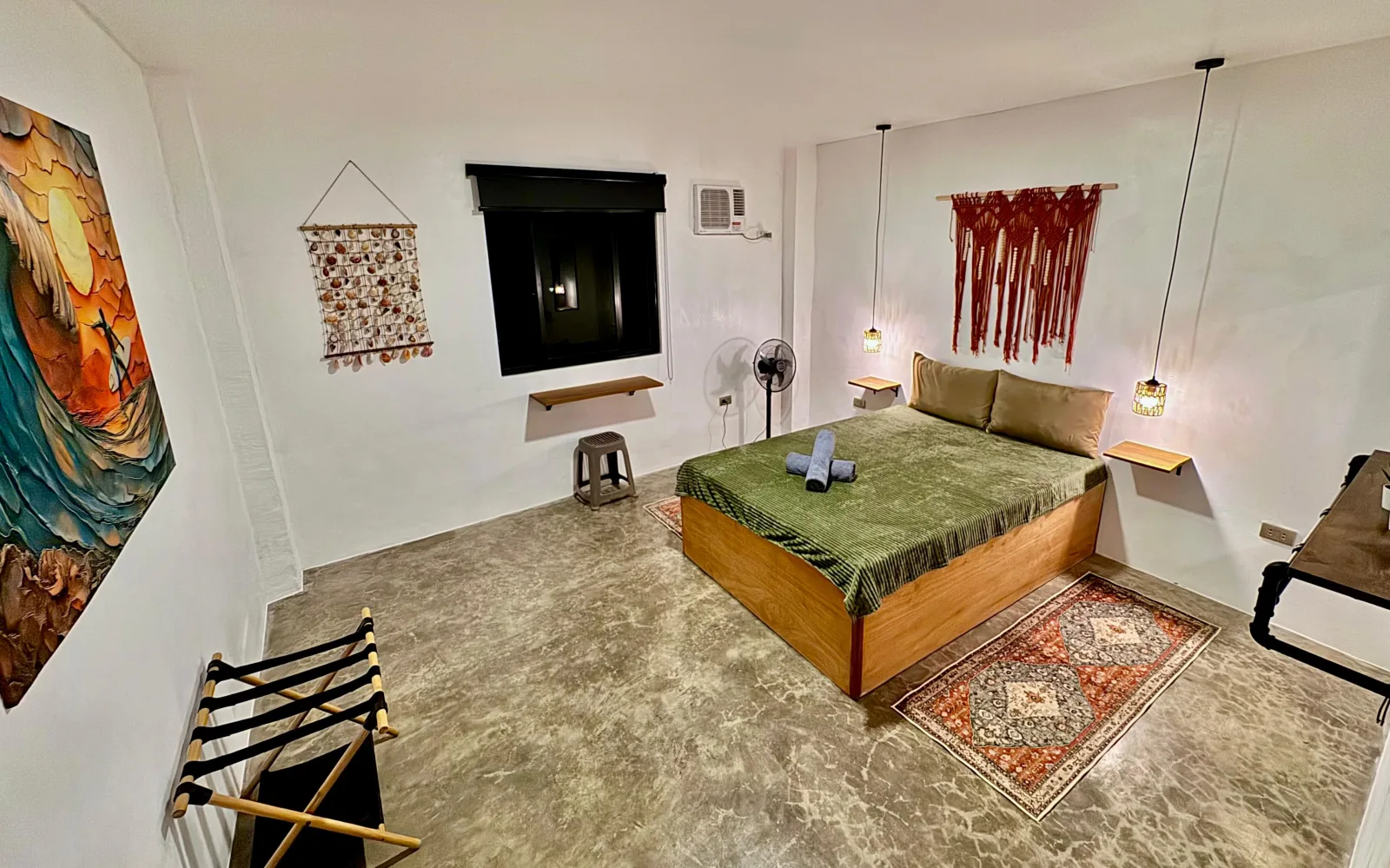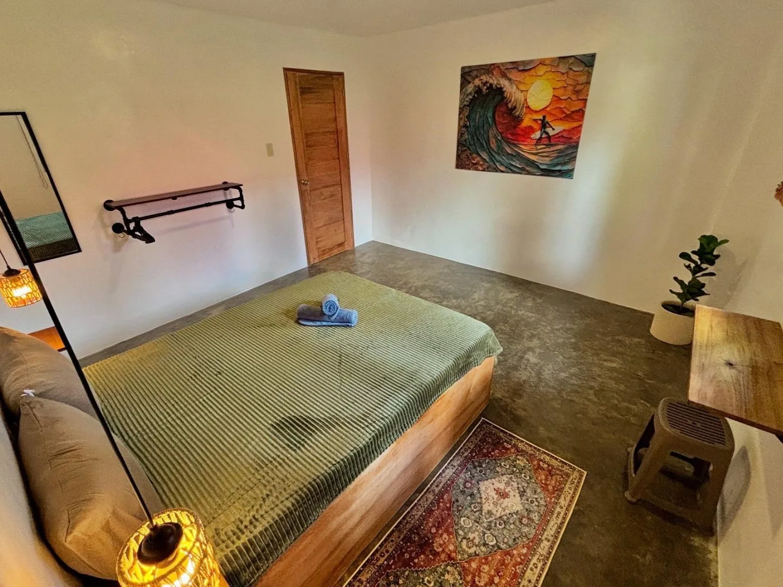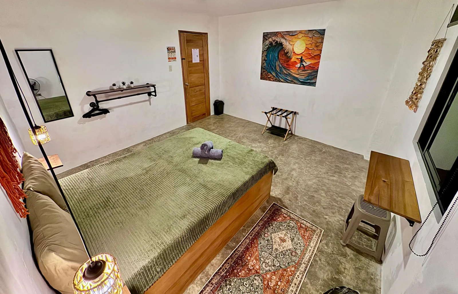 Our most romantic room. Luna glows with warm green and amber light, rich textiles, and a kingsize bed made for long, restful nights.